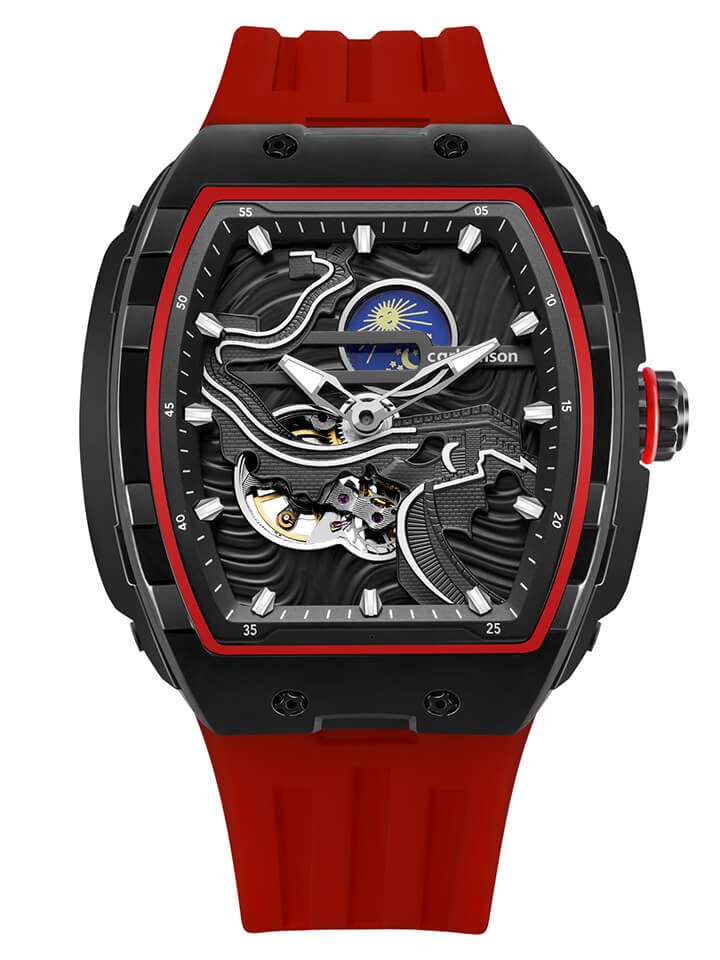 carl vinson® Men’s Automatic Mechanical Watch | Barrel-Shaped Skeleton Dial | Luminous Waterproof Wristwatch with Skin-Friendly Silicone Strap